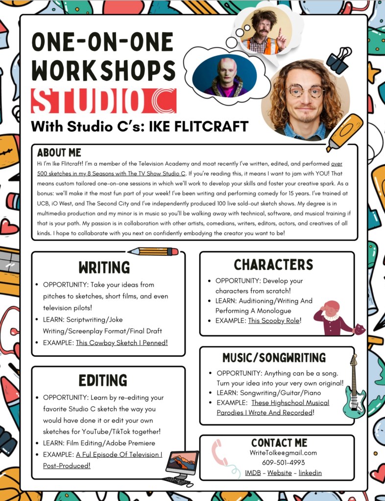 Ike Flitcraft is a member of the television academy who’s produced, written, edited, and performed over 500 sketches in his 8 Seasons with The TV Show Studio C. And if you’re reading this, he wants to jam with YOU! He’s been performing comedy for 15 years and trained at UCB, iO West, and The Second City. He’s independently produced 100 live sold-out sketch shows in Nashville and Los Angeles. He recently finished writing a musical about the life of Edgar Allan Poe for television and can be seen performing a fully improvised musical monthly at The Elysian theater in Los Angeles. His degree is in multimedia production and music business. He is proficient on five instruments and in adobe creative suite + Final Draft. His true passion is in collaborating with and imparting these skills and experiences upon the writers, editors, actors, and students he works with as they create their own wonderful pieces.